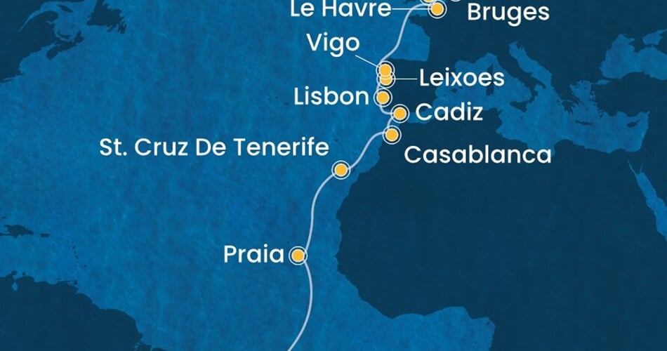 Maceio (Brazílie) - PRAIA - St. Cruz de Tenerife (Španělsko) - Casablanca (Maroko) - Cadiz (Španělsko) - Lisabon (Portugalsko) - Leixoes (Portugalsko) - Vigo (Španělsko) - Le Havre (Francie) - Southampton (Velká Británie) - Bruges (Belgie) - Kiel (Německo).
