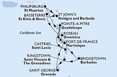 | 12. den | Fort-de-France (Martinik) | 07:00 | 23:00 |