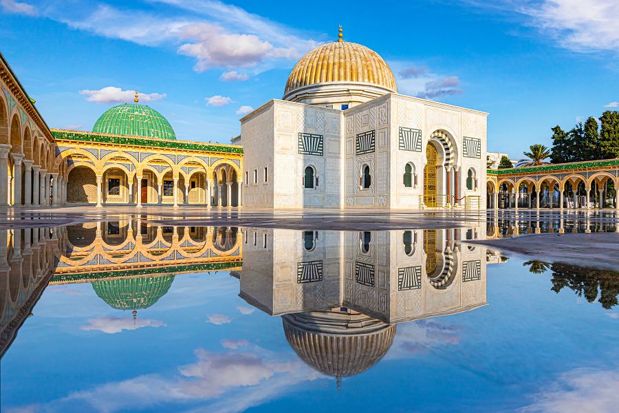 Nejprve navštívíme velkolepé Mauzoleum Habiba Bourguiby . Tato ikonická stavba se zlatými kupolemi a štíhlými minarety je místem posledního odpočinku prvního tuniského prezidenta a představuje mistrovské dílo moderní islámské architektury zdobené vzácným mramorem a jemnou keramikou.